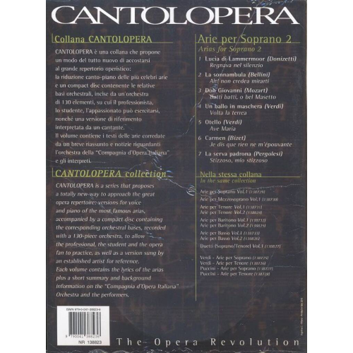 Cantolopera è una collana che propone un modo totalmente nuovo di approcciarsi al grande repertorio operistico: versioni per voce e pianoforte delle arie più celebri, accompagnate da un compact disc contenente le relative basi orchestrali, registrate con un'orchestra di 130 elementi, per consentire al professionista, allo studente e all'appassionato d'opera di esercitarsi, oltre a una versione cantata da un artista affermato come riferimento. Ogni volume contiene i testi delle arie, un breve riassunto e informazioni di base sull'Orchestra della Compagnia d'Opera Italiana e sugli interpreti. Il Volume 2 di Arias for Soprano include: Regnava nel silenzio (Donizetti) · Ah! non credea mirarti (Bellini) · Batti batti, o belMasetto (Mozart) · Volta la terrea fronte alle stelle (Verdi) · Je dis que rien ne m'epouvante (Bizet) · Stizzoso, mio ??stizzoso (Pergolesi).