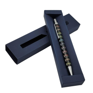 Penna a sfera con design musicale in scatola regalo di cartone blu scuro, note, tastiera - motivo: note colorate